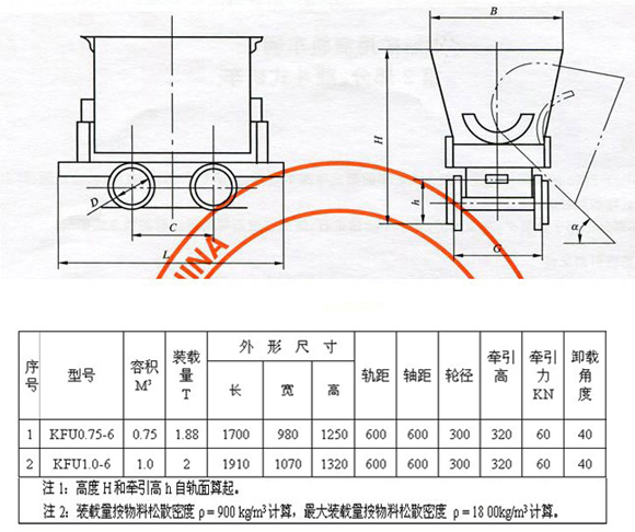 翻斗式礦車型號表示含義: 例:KFU0.75-6翻斗式礦車