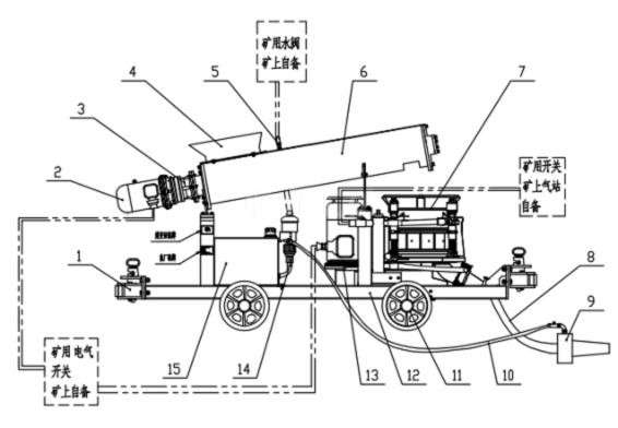 1、碰頭 2、電動機 3、減速機 4、進料斗 5、進水管路 6、攪拌機 7、噴射機 8、輸料管 9、噴頭10、輸液膠管 11、礦車輪對 12、車架 13、電動機 14、速凝劑泵 15、速凝劑箱